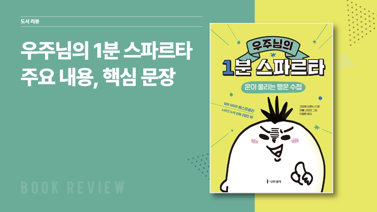 『우주님의 1분 스파르타: 운이 풀리는 행운 수첩』은 저자 고이케 히로시 빚을 갚기 위해 열심히 뛰어다니던 시절, 우주로부터 얻었던 힌트들을 추출하여 정리한 것으로, 유쾌하고 익살스러운 일러스트와 함께 100가지 우주의 법칙을 실행력을 높이도록 핵심만 깔끔하게 정리해 소개하는 책입니다. 하나의 법칙을 읽는 데 1분이면 되고, 그날 기분에 따라 어느 페이지를 펼치든 내게 필요한 힌트를 얻을 수 있고, 가볍게 실행해 볼 수 있는 메시지를 만날 수 있어 더 좋은 책입니다. 나의 사고방식을 바꿔 준 운이 풀리는 행운 수첩에 대해 이야기해보려고 합니다.